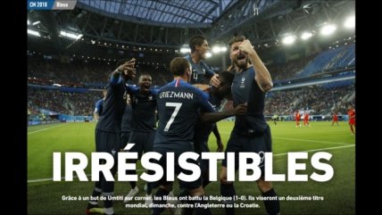 "Irresistibles": La exultante reacción de la prensa francesa por llegar a la final de Rusia 2018 10/07/2018 La prensa francesa reaccionó exultante luego de que la selección lograse su paso a la final del Mundial de Rusia 2018 al superar 1-0 a Bélgica en el partido jugado este martes en San Petersburgo.